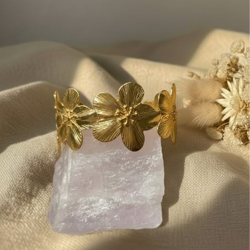 Découvre notre bracelet en acier inoxydable aux motifs floraux. Pensé pour les femmes actives qui ne veulent pas choisir entre style et durabilité, il t’accompagne partout, du bureau aux sorties plus sophistiquées. Son éclat doré illumine instantanément ton poignet avec une douceur printanière.